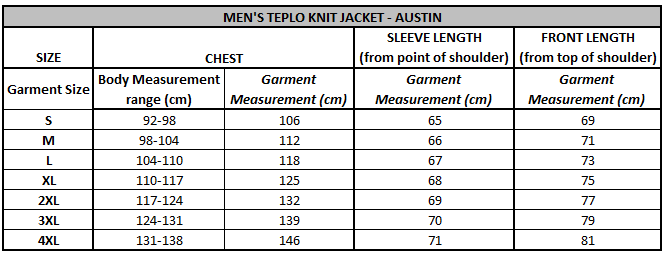 Material: 100% polyester Teplo Knit double sided anti-pill fleece Fit: Regular Weight: 600g Sizing: SIZE CHART